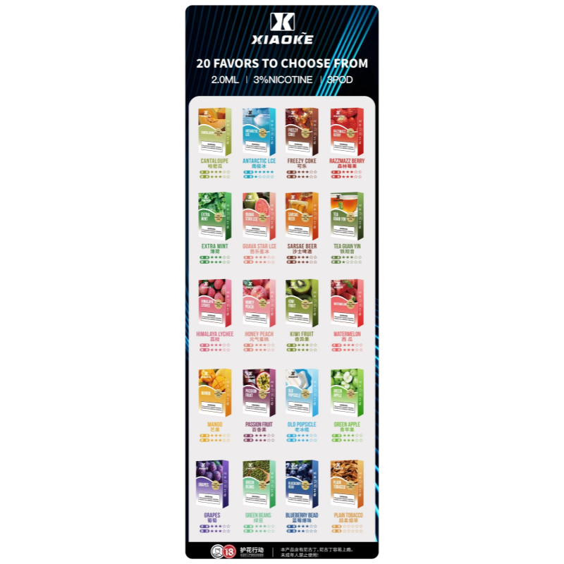 - 20種口味:從高涼度到低涼度不同涼度口味,XIAOKE梟客一代煙彈都能滿足到客戶不同的味蕾。